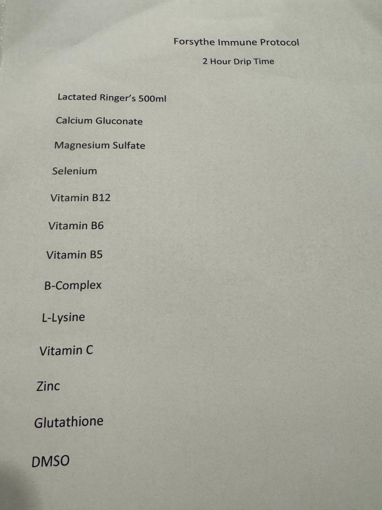 Thankful that week 1 went well and ready to go for whatever lies ahead. Today was more of the alternative therapies, which includes the immune “cocktail” that I had mentioned last week. I attached a pic of the ingredients for everyone to make at home. Kidding. T his little mix is quite potent, and not just on the healing end. Apparently I can clear a room immediately upon walking in, lol. The DMSO in it has a very strong smell, especially when it is coming out of the pores. It’s funny because I have had it described as quite a few things (egg, olives and sweet banana pudding to name a few) and I just cannot smell it. Maybe I need to find a way to weaponize it and use it for my own gain, eh? Whatever the smell, it is beating cancer down currently and luckily for anyone near me today, I only will have it one more time next week. Good thing my wife already likes me, right?